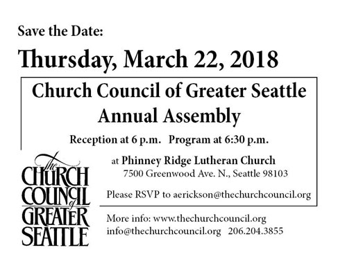 You are invited to the Church Council of Greater Seattle’s Annual Assembly on Thursday, March 22 at Phinney Ridge Lutheran Church, 7500 Greenwood Ave. N., Seattle 98103. There will be a reception at 6 p.m. and the programming will begin at 6:30 p.m. All are welcome! Limited free parking is available in the lot on a first come, first serve basis. The #5 bus line also serves Phinney Ridge Lutheran.